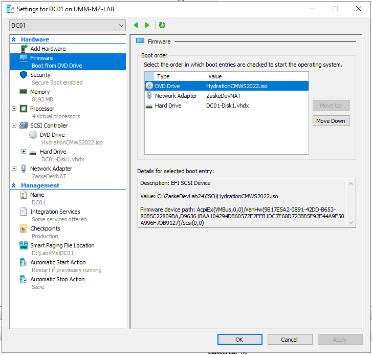 PS C:\HydrationSetup\HydrationKitWS2022-main-2024> .\New-LabVMsForHyperV.ps1 -VMNetwork ZaskeDevNAT -ISO C:\ZaskeDevLab\ISO\HydrationCMWS2022.iso -VMLocation D:\LabVMs -SelectVMs CM